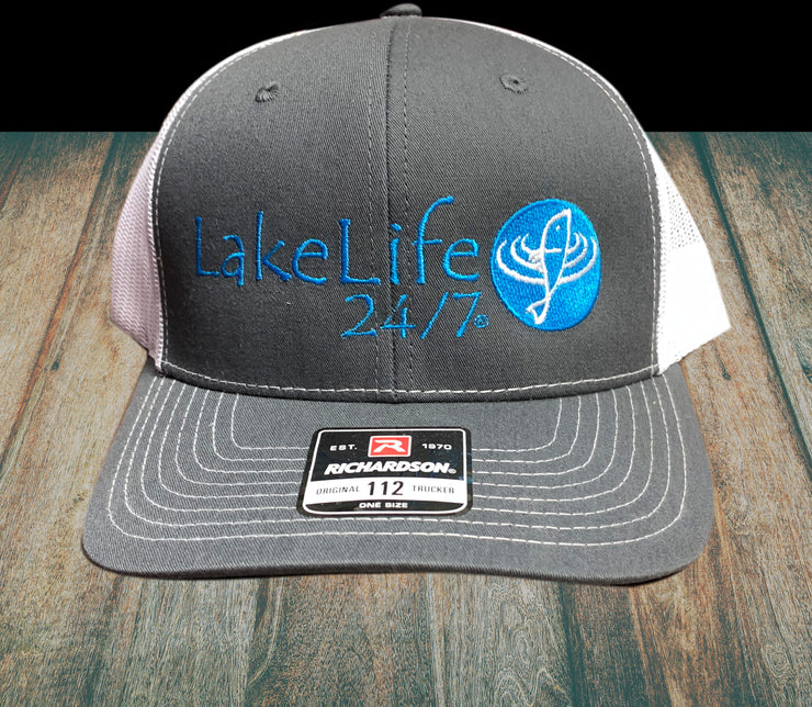 You don’t have to have a CDL to wear these trucker hats! Fashionable with snap back, easy fit, these Richardson 112 hats are a perfect complement to your LakeLife 24/7 lifestyle. White mesh back with charcoal grey front perfectly displays our embroidered LakeLife 24/7® logo, you’ll be in the driver’s seat.